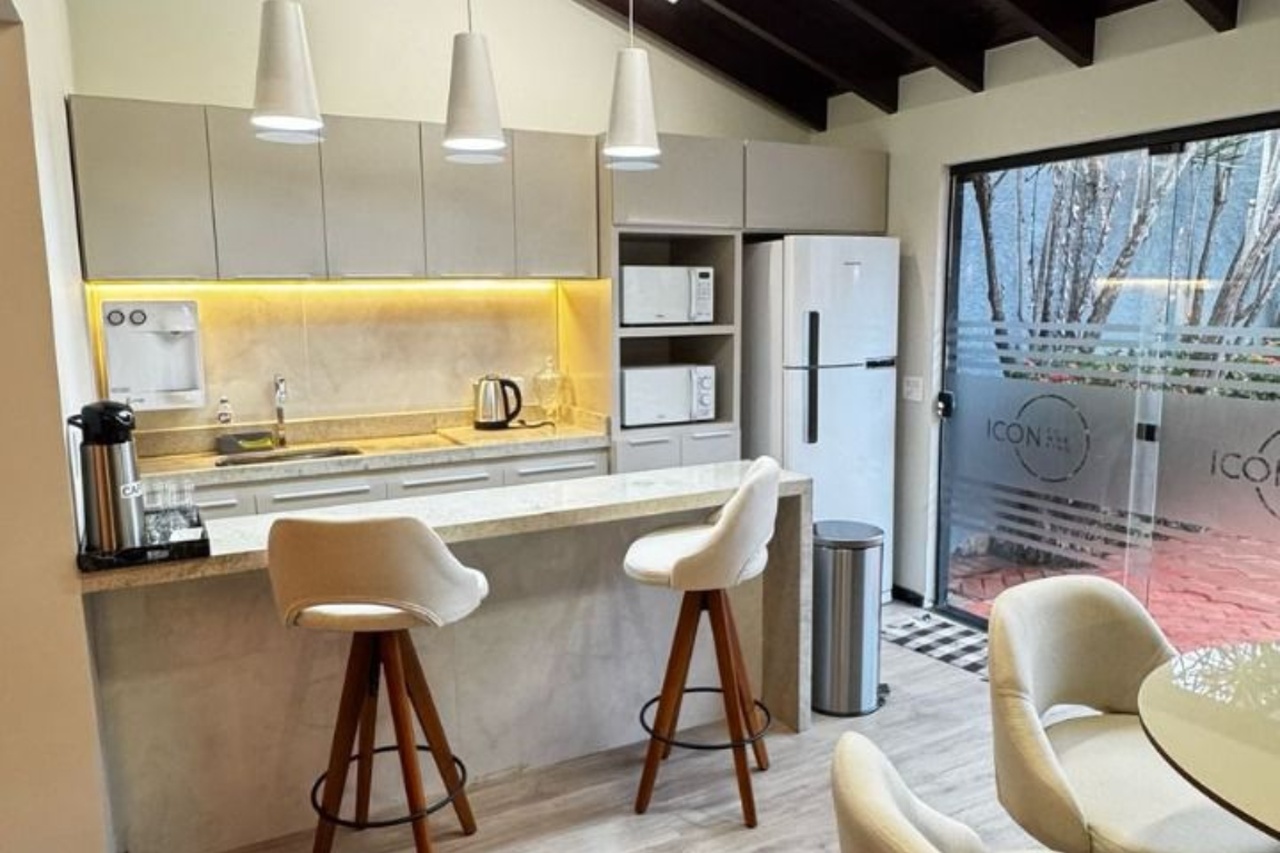 Estações de trabalho em salas compartilhadas para profissionais que buscam um ambiente colaborativo, confortável e moderno.